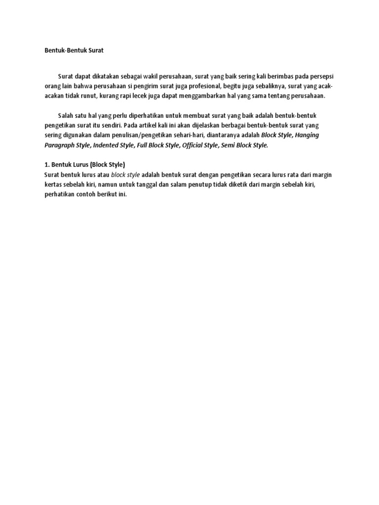 Bentuk-bentuk surat from 3.bp.blogspot.com Contoh surat bentuk menggantung hanging paragraph style. Ada berbagai macam bentuk surat yang biasa digunakan dalam korespondensi. Surat bentuk alinea menggantung atau hanging paragraph style. Berikut adalah contoh surat menggantung atau hanging paragraph style : Pada setiap alinea format surat ini, bentuknya menggantung atau hanya pada bagian awal alineanya saja yang dimulai. Apa itu surat penawaran barang? Contoh surat penawaran bentuk hanging paragraph style : Contoh surat penawaran model full block style.
